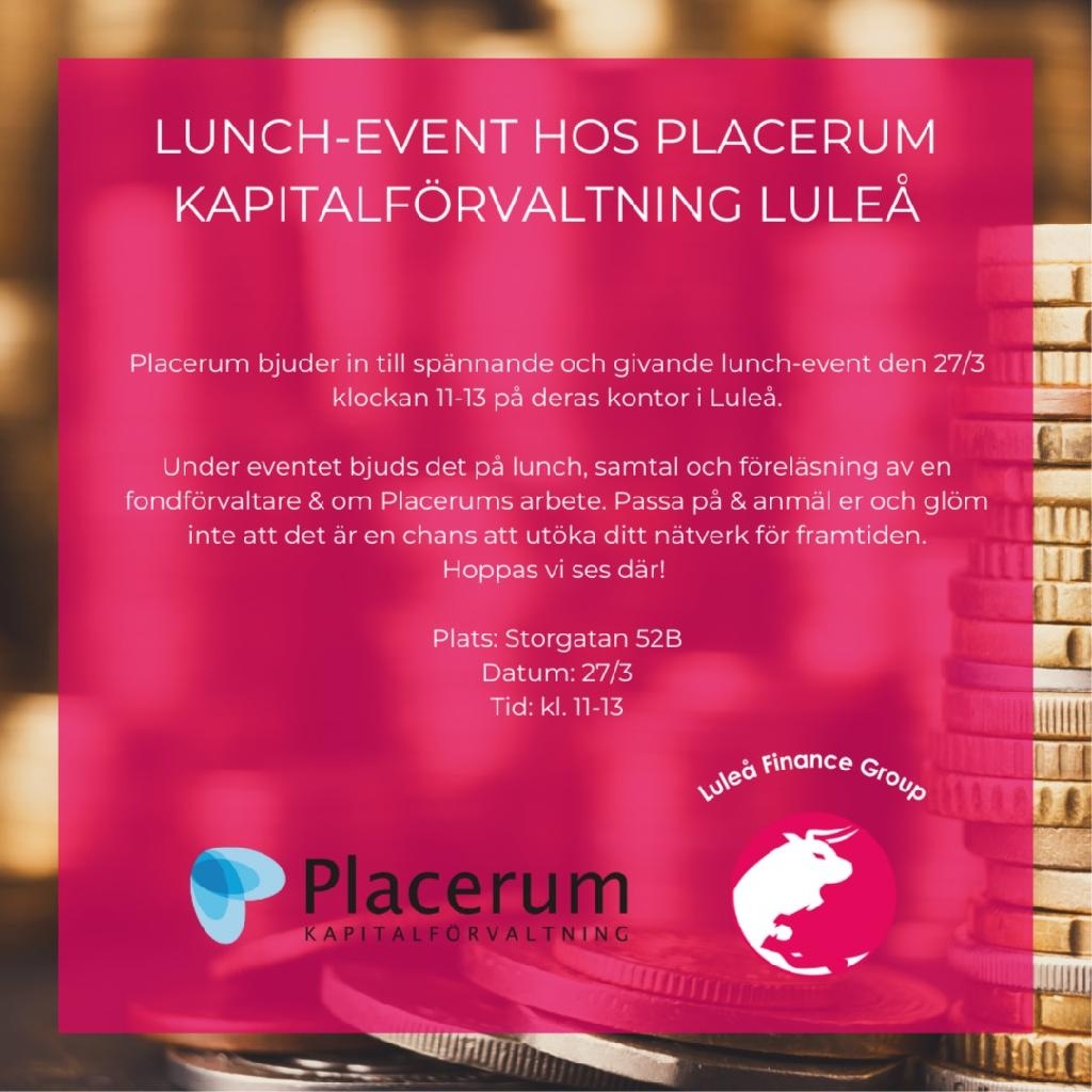 Den 27 mars kl. 11–13 bjuder vi i Luleå Finance Group in dig som student till ett exklusivt besök hos Placerum Kapitalförvaltning i Luleå.