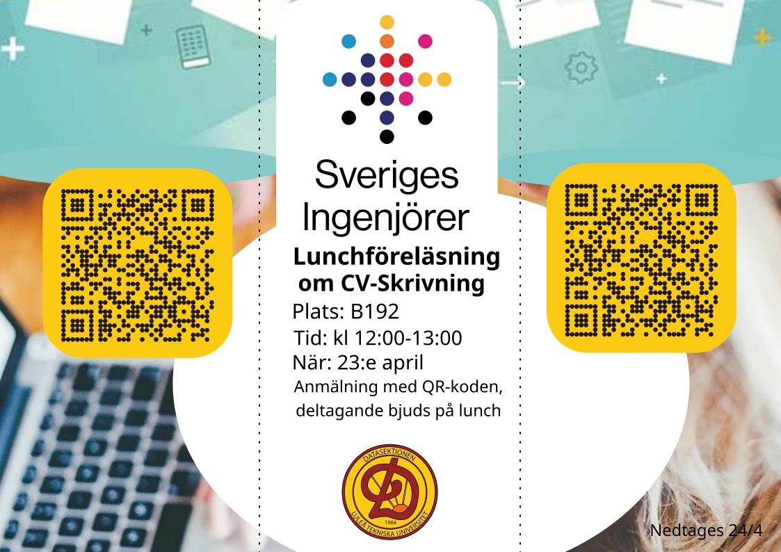 Sveriges Ingenjörer kommer förbi och bjuder på en lunchföreläsning om CV-skrivning och om vilka de är. Mer information om Sveriges Ingenjörer finns nedan: