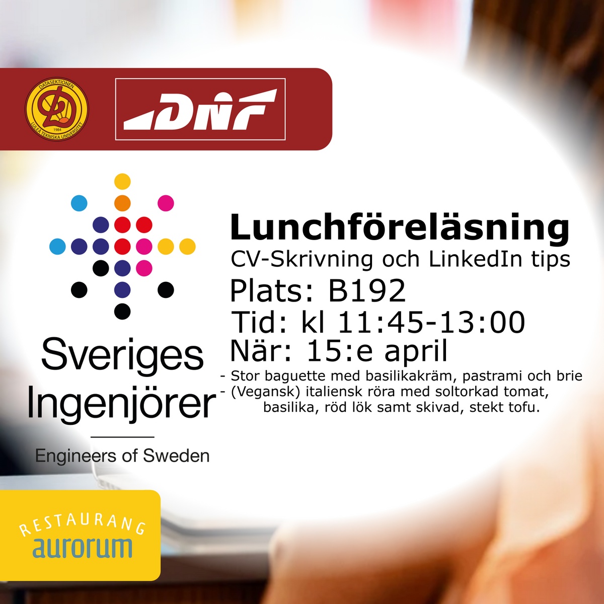 Sveriges Ingenjörer kommer förbi och bjuder på en lunchföreläsning om CV-skrivning, LinkedIn tips och om vad de kan göra för dig som framtida ingenjör. Mer information om Sveriges Ingenjörer finns nedan: