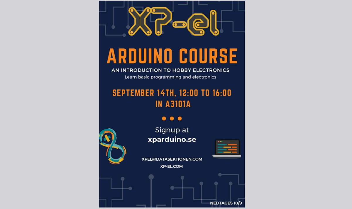 XP-el kommer att hålla i en Arduino-kurs på 14/9 i A3101A. 12:00-16:00. Tag med egen dator och ett gott humör så kör vi. För att delta krävs att man anmält sig genom formuläret nedan.